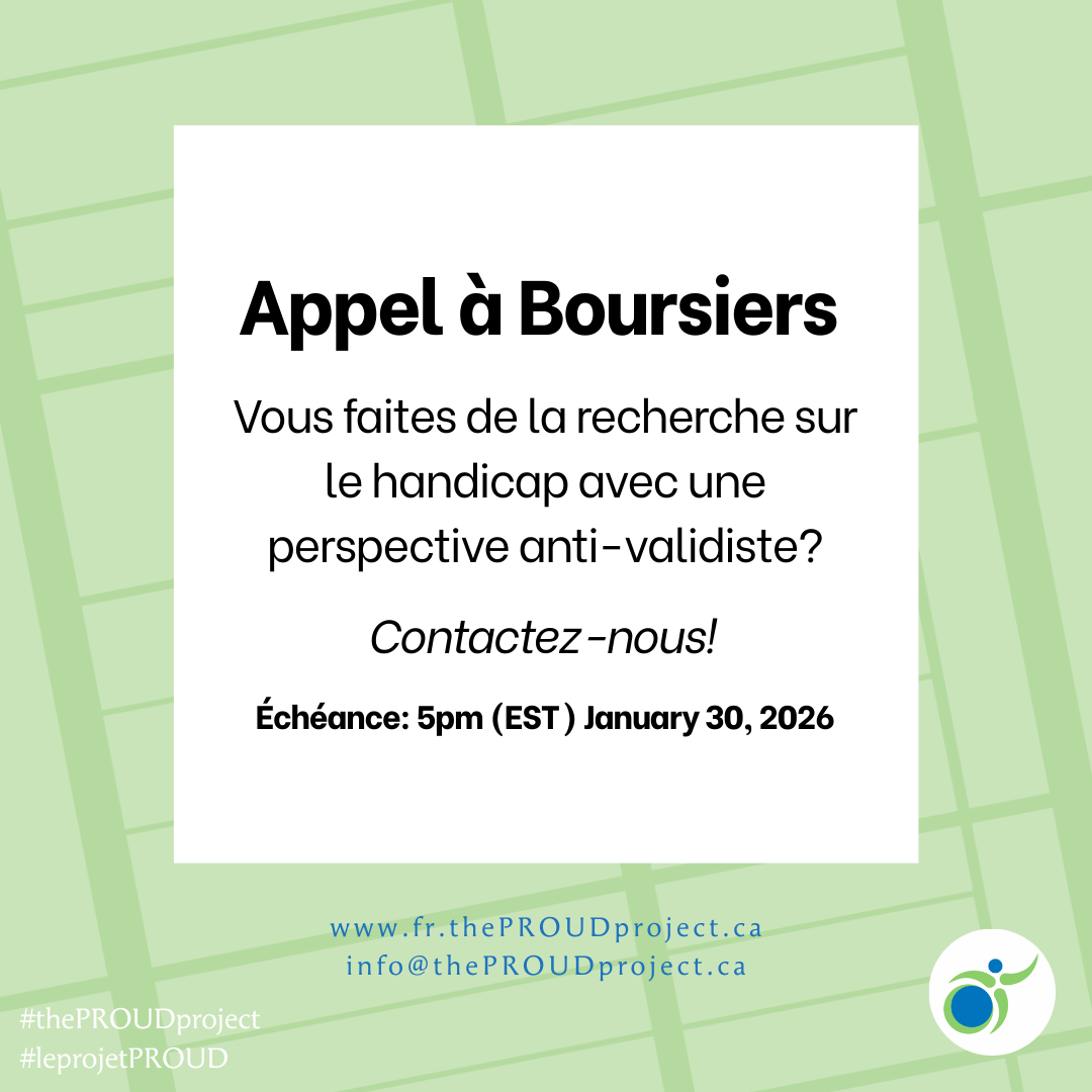 Merci encore pour votre soutien cette année. Vu les coupes de budgets du gouvernement canadien, le projet PROUD est à la recherche de dons privés pour être en mesure de continuer à financer notre travail et nos recherches anti-capactistes et pro-handicap. Si vous, ou quelqu’un que vous connaissez, êtes prêts à contribuer à cet effort, veuillez nous contacter à [email protected] ou envoyer vos transferts électroniques à [email protected]. Nous sommes une organisation de charité enregistrée et pouvons fournir un reçu fiscal pour don de bienfaisance pour l’année 2025 aux personnes effectuant un don avant le 31 décembre.