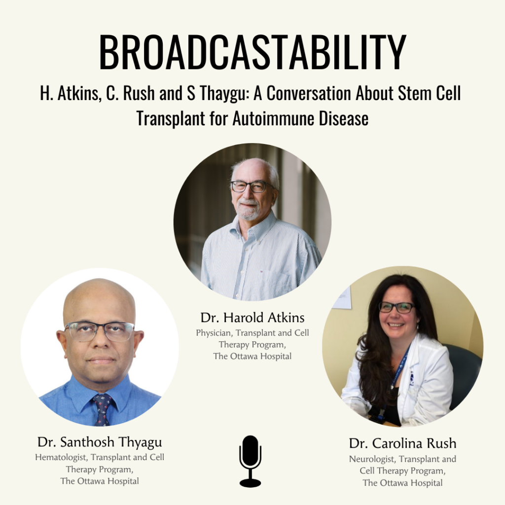 - And in the fourth episode we speak with The Ottawa Hospital stem cell transplant team—Drs. Harold Atkins, Santhosh Thyagu, and Carolina Rush—who not only give insight into their cutting-edge medical process, but connect with PROUD’s Co-Executive Director Chloë Atkins (no relation to Dr. Atkins) who was a recent patient of The Ottawa Hospital team.