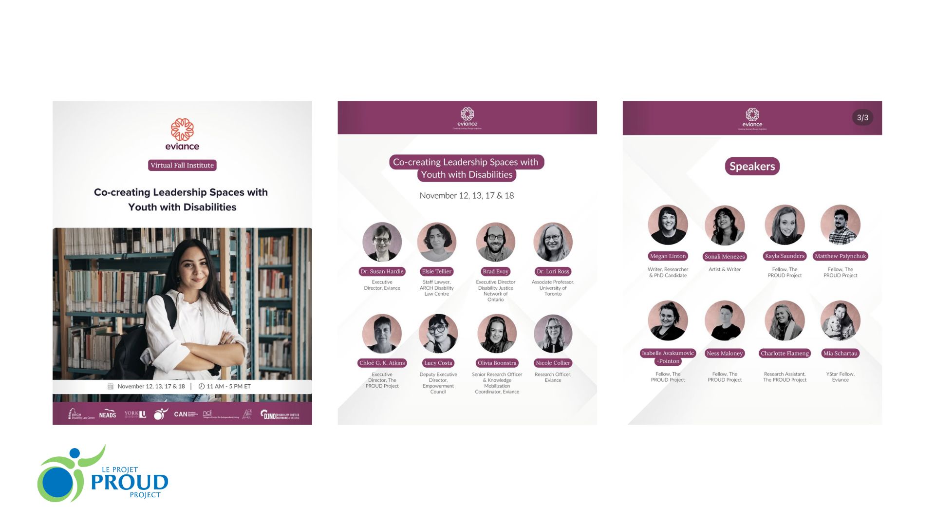 During the month of November, PROUD collaborated with Eviance in their Fall Institute: Co-Creating Leadership Spaces with Youth with Disabilities. Over the four-day virtual conference, three PROUD members participated in a young researcher showcase—Isabelle Avakumovic-Pointon, Kayla Saunders, and Ness Maloney—and Co-Executive Director Chloë Atkins presented on PROUD’s ongoing Phenomenological Analysis of Disability and Employment in Five Countries study and some preliminary findings on this work. To learn more, visit the “Current Projects” tab on our website.